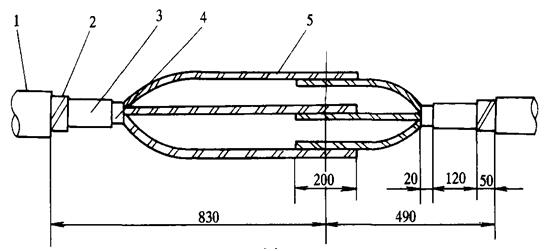 熱縮型電纜中間接頭分紙絕緣型和交聯(lián)型兩大類型,前者適用于浸漬紙絕緣電纜,后者適用于塑料和交聯(lián)電纜。兩種類型中間接頭在結(jié)構(gòu)上的主要區(qū)別在于,前者有隔油管而后者沒有,其結(jié)構(gòu)見圖3-109和圖3-110制作工藝簡(jiǎn)述如下。
