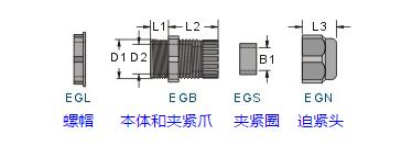 | ※ | 若分開訂購各零件時,請在型號后面加上各代號:螺帽(L) 墊片(W) 本體(B) 夾緊圈(S) 迫緊頭(N)例:訂購EG-7螺帽,型號為EGL-7。 |